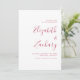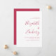 Esta sencilla pero audaz boda moderna, salvo la tarjeta de fecha, incluye texto magenta en caligrafía elegante de escritura a mano y letra sans serif, alineada con el margen derecho sobre un fondo blanco. La parte posterior de la tarjeta es magenta sólida.