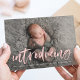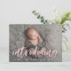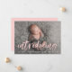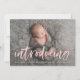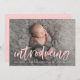 Tarjeta de anuncio de foto-nacimiento moderna que presenta la foto horizontal del recién nacido de su bebé con "presentación" mostrada en un sobrepeso de escritura rosa claro y cepillo. Personalice el frente de los simples anuncios de nacimiento con el nombre del bebé y las estadísticas de nacimiento. La tarjeta se invierte para mostrar un fondo sólido rosa con espacio para fotos y texto adicionales.