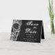 Cabecera gótica de media calavera Guardar la tarjeta plegada de invitación de Hallowedding estilo vintage blanco y negro de la fecha. Divertido, espeluznante, gótico Halloween hasta la muerte nos hace una tipografía de parte. Derechos de imagen de Marg Seregelyi Photography.