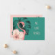 Un flamenco de bonito con un hibisco tropical se exhibe contra una verde azulada hoja de monastera sobre un fondo azul-verde. El texto rosado delante de nuestra tarjeta de invitación de cambio de dirección dice: "Nos hemos movido" y estas palabras se pueden cambiar a las suyas en la plantilla, junto con la nueva información de dirección en la parte posterior de la tarjeta.
