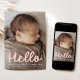Bienvenidos a su bebé con este encantador anuncio de nacimiento de fotos con su foto vertical y "Hola" en escritura manuscrita de color rosa suave. Debajo, su nombre y los detalles de su nacimiento aparecen en un texto blanco limpio. La parte de atrás muestra un fondo rosado coincidente con un collage de 4 fotos y un espacio para un mensaje personalizado, perfecto para compartir tu alegría con tus seres queridos.