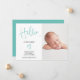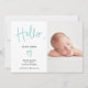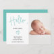 Una tipografía moderna, simple y elegante de guión hola anuncio de nacimiento de un niño con un collage de fotos y una caligrafía tipográfica elegante, con hola nombre de bebé. ¡Presentando a su bebé! El color verde azulado de fondo turquesa es totalmente editable.