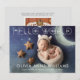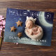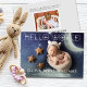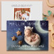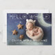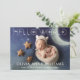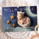 Anuncio de nacimiento de nuevo bebé "Hola Mundo" Tarjeta de 2 fotos con superposición en blanco. El reverso tiene un fondo gris claro con texto gris oscuro