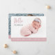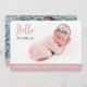 Tarjeta de anuncio de nacimiento simple y moderna que incluye una plantilla de foto con un texto superpuesto en antiguos tipos de letra rosa y gris oscuro que dice Hola, soy Amelia (personalizable con el nombre de su bebé). La antigua banda rosa de la parte inferior es personalizable con las estadísticas de nacimiento con letras blancas. La parte posterior de la tarjeta contiene una segunda plantilla de fotos para personalizar con una fotografía de la familia o de los hermanos, o con otra imagen de la bebé recién nacida. La banda rosa antigua de la parte inferior es personalizable con más detalles o mensajes personalizados con un tipo de letra blanco elegante.