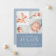 Los elegantes anuncios de natalidad incluyen cuatro fotos de recién nacidos dispuestas en un diseño de collage en un polvoriento fondo azul. "Introducing [name]" aparece debajo de la secuencia de comandos de caligrafía de moda y la inscripción de bloques clásica. Personalice con el nombre completo del bebé, estadísticas de nacimiento y una firma familiar en la parte inferior. Un diseño simple y limpio y neutral de género para anunciar la llegada de tu pequeño.