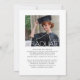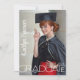 Anuncie el logro de su graduado con este superpuesto de texto fotográfico de sangre completa con tipografía moderna y elegante en su elección de colores para destacar en su guión de fotografía y caligrafía de moda para el nombre. La parte posterior incluye una foto y el texto de su personalizado para incluir información adicional. Se pueden editar todos los estilos de fuente de texto, colores, tamaño y ubicación, así como los colores gráficos GRADUATE. ASISTENCIA: Para obtener ayuda con la modificación o personalización del diseño, el cambio de color, el redimensionamiento, la transferencia del diseño a otro producto o si desea coordinar elementos, póngase en contacto con el diseñador ANTES DE PEDIDOS a través de la pestaña del MENSAJE de charla de Zazzle, o envíe un correo electrónico a makeitaboutyoustore@gmail.com.