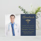 Envíe a su familia y amigos una tarjeta única de graduación de fotos médicas personalizada para que la miren. Este diseño de plantilla muestra su foto personalizado a la izquierda y a la derecha un falso oro caduceus con la palabra "Graduado", clase/año, nombre, grado y otros detalles de la ceremonia para personalizar sobre un fondo azul clásico. Diseñado por Susan Coffey.