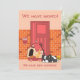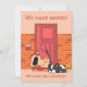 Ilustración divertida de un lindo perro que se cansó de mudar su casa y juguetes, y se durmió cansado afuera de la puerta de su nuevo hogar. Esta ilustración adorable es ideal si deseas informar a amigos y familiares que te has mudado. Ideal para amantes de los perros.