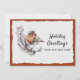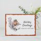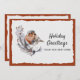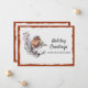 Un lindo petirrojo de invierno de color óxido y gris se posa en una rama de hojas blancas y verdes contra un fondo de papel con borde dentado blanco nevado. El diseño en sí está superpuesto sobre un cálido color óxido tomado de las propias plumas del ave. El texto de ejemplo en la parte frontal de nuestra nueva tarjeta plana de Navidad de dirección dice "Saludos navideños de nuestro nuevo hogar". Este texto y todo el texto en la parte posterior de la tarjeta se pueden revisar fácilmente, o eliminar para escribir a mano, a través de la plantilla de personalización.
