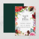 Flores de acuarela de estilo bohemio elegante, plumas y armazón de follaje en tonos burdeos, rosa, verde, rojo, violeta y melocotón, Boda salva la tarjeta de fecha. La parte posterior de la tarjeta presenta un color verde esmeralda sólido.