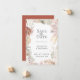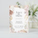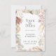 Elegante moda bohemia seca flores y marco follaje, Boda Guardar la tarjeta de fecha. El marco está decorado con palmeras secas, rosas, orquídeas y pampas de césped en una moderna paleta de colores neutros. La parte posterior de la tarjeta se muestra en color naranja quemado sólido.