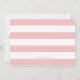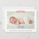 Delicadas hojas y flores de diseño en verde pálido y rosa forman un "marco" de esquina sobre tu foto en el medio. La parte trasera está decorada con rayas modernas de color rosa y blanco (el rosa se puede personalizar según el color que se desee). ¡Comparte tus grandes noticias con la familia y amigos con estilo!