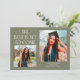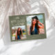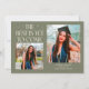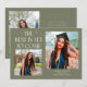 Tarjeta de anuncio de graduación moderna y caprichosa con 2 fotos en la parte frontal y 1 en la parte trasera. El texto dice "Lo Mejor Está Por Llegar" con estrellas brillantes. Agregue el nombre del graduado, información y mensaje para personalizar esta tarjeta. Color verde sage.
