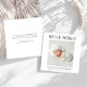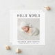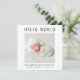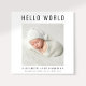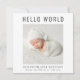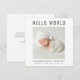 Un elegante anuncio minimalista de nacimiento cuadrado para presentar a su recién nacido a amigos y familia presentando "Hello World" con letras grandes, su foto y su nombre, fecha de nacimiento y estadísticas de nacimiento en una simple tipografía moderna. En la parte posterior, agregue su mensaje personalizado.