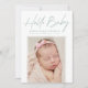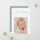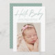 Tarjeta de anuncio de nacimiento moderna que incluye "Hello Baby" en un guión de firma verde de menta oscura con el nombre de su bebé, estadísticas de nacimiento y foto que se muestra a continuación. La tarjeta de anuncio de nacimiento de la foto se revierte para mostrar una foto adicional y un mensaje personal con fondo de punto de polka blanco y menta.