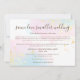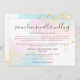 Para ocasiones en que una ceremonia de boda socialmente distanciada es necesaria y es necesario desinvitar a algunos invitados y para invitarlos a la transmisión en vivo, este diseño moderno y contemporáneo tiene un encabezado en un elegante guión y un hermoso fondo de lavado de acuarela en tonos de rosa y azul turquesa con salpicaduras doradas. Un fondo coordinado también está en la parte posterior. Personalice fácilmente el texto con sus propios detalles.