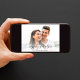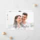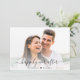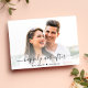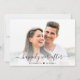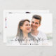 invitación de compromiso de moda con tu foto mostrando "felizmente siempre después" en un guión elegante con toques y tus nombres unidos con un corazón. En la parte posterior, agregue dos fotos adicionales, personalizar su mensaje y agregue sus primeros nombres en un script tipo firma.