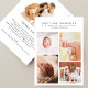 Esta tarjeta de agradecimiento de fotos modernas de moda es ideal para todo aquel que quiera agradecer a los invitados en su ducha de bebé por los regalos, el amor y el apoyo que han recibido, y para presentar a su nuevo miembro de la familia. El elegante diseño tiene un estilo minimalista y cuenta con cuatro fotos de personalizable colocadas en un collage y una tipografía clásica elegante para su información. Al contrario, hay una quinta foto y un mensaje de agradecimiento a tu personalizable con tus nombres. Utilice el botón "personalizar" para reemplazar fotos y editar texto. Sencillo y bonito.