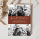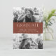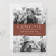 ¡Celebra el gran hito de tu graduación con estos modernos anuncios de graduación! La invitación de graduación de dos fotos muestra "Graduado" en el centro del diseño con letras blancas modernas y fondo marrón con bordes rotos. Personalice la invitación agregando el nombre del graduado, el nombre de la escuela y el año de graduación. La tarjeta se invierte para mostrar un patrón de rayas marrón y blanca texturado.