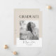 This elegant graduation announcement design features a modern, minimalist layout in warm neutral tones of white and light brown. The front showcases the word “GRADUATE” in a clean, all-caps sans-serif font centered above a customizable photo of your graduate. Beneath the photo, your graduate’s name, school, and class year are displayed in a delicate handwritten script font, adding a personal and refined touch.