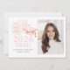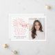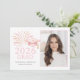 Celebrate your 2026 graduate with this pink and gold graduation announcement featuring a blush grad cap, gold tassel and sparkling fireworks with photo template. A modern, elegant design perfect for a stylish high school or college grad celebration.