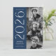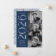 Elegante invitación de graduación con las tres fotos del graduado ubicadas a la derecha del diseño en un diseño vertical. El 2025 se exhibe con letras blancas y modernas, con un fondo marino. Personalice la moderna invitación de graduación fotográfica añadiendo el nombre del graduado y el nombre de la escuela. El diseño se invierte para mostrar un fondo giratorio geométrico marino y blanco. ¡Perfecto tanto para graduados de secundaria como universitarios!