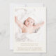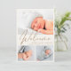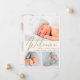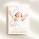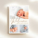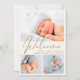 Un simple y elegante anuncio de nacimiento de crema clara con un collage de 3 fotos de tu recién nacido con "Bienvenida" en un elegante guión de oro. Añada el nombre, la fecha de nacimiento y las estadísticas de nacimiento de su bebé. En la parte de atrás, agrega otra foto y tu mensaje personalizado a la familia y amigos.