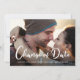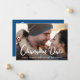 Aunque las circunstancias han requerido que pospongas la fecha de tu boda, muestra a tus invitados que tu amor sigue adelante con tu fotografía de compromiso favorita en esta tarjeta de anuncio de cambio de fecha de boda. En el anverso, "Cambio de Fecha" está escrito en una gran letra cursiva blanca contemporánea en la parte inferior de tu foto, y debajo puedes personalizar tus nombres y anuncio de aplazamiento. En el reverso, puedes personalizar tu mensaje con más detalle y agregar la nueva fecha y lugar de la boda, todo en una tipografía blanca simple sobre un fondo azul clásico.