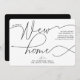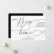 Una manera simple pero hermosa anuncia tu movimiento. El diseño presenta un fondo blanco moderno con un encabezado negro que dice "Tenemos un nuevo hogar" en una combinación de fuentes de moda. Personalice su dirección y sus nombres en la parte delantera y, en la parte posterior, puede agregar otro mensaje a sus amigos y familiares.