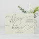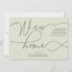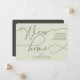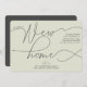 Una manera simple pero hermosa anuncia tu movimiento. El diseño presenta un fondo verde pálido moderno con un encabezado que dice "Tenemos un nuevo hogar" en una combinación de fuentes de moda. Personalice su dirección y sus nombres en la parte delantera y, en la parte posterior, puede agregar otro mensaje a sus amigos y familiares.