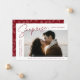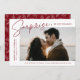 Comparte la noticia de tu sorprendente compromiso con estas elegantes invitaciones de compromiso fotográfico. El diseño incluye la frase "¡Sorpresa, nos comprometimos!" en un guión burdeos y letras modernas. Su foto de compromiso se muestra en la parte central derecha del diseño con sus nombres y fecha de compromiso mostrados a la izquierda. Personalice la invitación de compromiso sorpresa añadiendo más detalles a continuación, como ciudad/estado boda, sitio web boda, etc. La invitación se invierte para mostrar un patrón follaje blanco en un fondo borgoñoso.