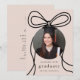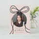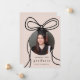 Esta elegante foto de una fiesta de graduación de color rosa y negro, con el anuncio de la fecha, incluye una proa negra de moda con una moderna foto circular en un simple fondo de color negro, e incluye guardar los detalles de la fiesta de graduación en la parte posterior.