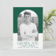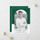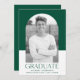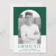 Invitación de graduación simple y elegante con la foto del graduado dentro de un marco de arco con fondo de bloques de color verde y blanco. El "Graduado" se muestra en letras verdes y modernas con el nombre del graduado, la escuela y el año de graduación que se muestra a continuación.