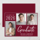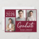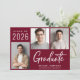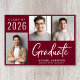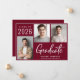 Moderna invitación de graduación de color rojo burdeos con 3 fotos y "Graduado" en un guión blanco contemporáneo. Añada el nombre del graduado, el año de clase y la escuela o universidad en simple tipografía blanca.