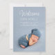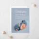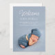 Tarjeta de anuncio de nacimiento con 2 fotos modernas y texto blanco. Este elegante anuncio de bebé presenta una foto del bebé en un marco completo de color azul polvoriento, letras elegantes de "Bienvenido", el nombre del bebé y detalles de nacimiento en una fuente sans serif. Parte posterior con foto personalizada y texto de anuncio de nacimiento en gris. Utilice la plantilla de diseño fácil de personalizar y cree un momento mágico único para su familia y amigos. © y.BEE PAPERIE #ZazzleMade #anuncio-de-nacimiento #tarjeta-de-anuncio-de-nacimiento #anuncio-de-bebé