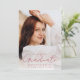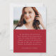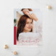 Anuncie los logros y planes de tu graduación con esta elegante y moderna invitación de graduación fotográfica. La parte delantera de la invitación muestra la foto vertical de sangre completa del graduado. "Graduado" se muestra en un guión rojo a la moda y escrito a mano. Personalice la invitación con el año de graduación, el nombre del graduado y el nombre de la escuela. La invitación se invierte para mostrar una foto adicional con el texto de su personalizado debajo con letras blancas con un fondo rojo sólido. Esta invitación de graduación fotográfica es perfecta para graduaciones de secundaria o universitarias.