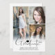 Anuncie el logro de su graduado de secundaria o universitario con esta moderna tarjeta de invitación con un diseño elegante de títulos GRADUATE con letras a mano, acentuado con un límite de graduación en su elección de colores y 4 fotos (3 en la parte delantera y 1 en la parte posterior). La parte posterior ofrece un campo de texto para obtener información sobre los logros, actividades y planes futuros de tu graduado. CAMBIOS: cambie cualquier texto o color gráfico en EDIT. ASISTENCIA: Para obtener ayuda con la modificación/personalización del diseño, la transferencia del diseño a otro producto o si desea coordinar elementos, póngase en contacto con el diseñador ANTES DE PEDIDOS a través de la pestaña MENSAJE de conversación Zazzle o envíe un correo electrónico a makeitaboutyoustore@gmail.com.