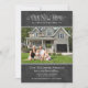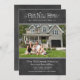 Una invitación rústica y conmovedora presenta un encantador guión con el título "Nuestro nuevo hogar" con un acento cardíaco y de desplazamiento, una foto de su nuevo hogar enmarcado en un borde de puntos, un texto personalizado con un aspecto escrito a mano en tiza blanca y un fondo con un aspecto de pizarra negra texturada.