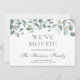 Elegante hogar nuevo y cambio de dirección tarjeta de invitación móvil con colores de agua verde eucalipto. En el frente, personalice el nombre de su familia en un elegante guión verde sabio, cambie el título "Hemos movido" si lo desea y añada su nueva dirección. En el reverso, personalice su invitación con más detalle e incluya números de teléfono y direcciones de correo electrónico si lo desea.
