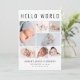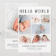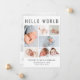 Un elegante anuncio de nacimiento para presentar a su recién nacido a amigos y familia con "Hola Mundo" en letras grandes, un collage de 7 fotos y su nombre, fecha de nacimiento y estadísticas de nacimiento en una simple tipografía moderna. En la parte posterior, agregue una foto adicional y su mensaje personalizado.