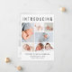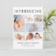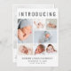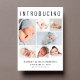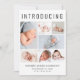 Un elegante anuncio de nacimiento para presentar a tu recién nacido a amigos y familia con "Introducing" en la parte superior con letras grandes, un collage de 7 fotos y su nombre, fecha de nacimiento y estadísticas de nacimiento en una simple tipografía moderna. En la parte posterior, agregue otra foto y su mensaje personalizado.