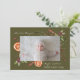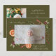 Tarjeta de anuncio de nacimiento de vacaciones rústica y moderna con 2 fotos de su recién nacido con ilustracion acuarela de botánicos invernales incluyendo mistletoe, rama de pino, bayas, naranja, etc. El fondo es verde oliva.
