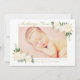 Esta preciosa tarjeta de anuncio de nacimiento de fotos presenta a su hermosa bebé con una foto recién nacida y un texto elegante que puede ser personalizado para incluir el nombre de su bebé en escritura, junto con información importante de nacimiento, y nombres de padres. La foto se acentúa con un diseño de color de agua de peonía floral y de vegetación de bosques en tonos crema, dorado, rubor, melocotón y verde. Un patrón de franjas horizontales blancas se viste por la parte posterior de la tarjeta. Se pueden modificar los colores de color rosa y melocotón dorado.