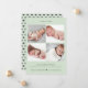 Tarjeta moderna de anuncio de nacimiento verde pálido, simple y elegante, con 4 fotos en una cuadrícula con tipografía gris moderna.