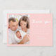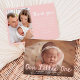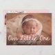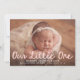Bienvenido a tu nueva llegada con este dulce y moderno anuncio de nacimiento de fotos de bebé con "Nuestro pequeño" escrito a mano en un suave guion rosa. La foto horizontal de su bebé es el punto central del frente, con su nombre y los detalles de su nacimiento mostrados elegantemente en un texto blanco limpio debajo. La parte posterior de la tarjeta incluye una foto vertical y un mensaje de agradecimiento al personalizable, que le permite compartir su alegría y gratitud con sus seres queridos. Un recuerdo perfecto para las niñas y una hermosa manera de celebrar este precioso momento.