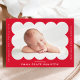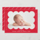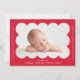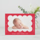 Un simple y moderno anuncio de nacimiento con la foto de su bebé enclavada en un marco rojo brillante. Personalice el anuncio de nacimiento rojo agregando el nombre de su bebé e información adicional en letras blancas. La parte posterior de la tarjeta presenta un diseño de banda mínima en rojo y blanco.