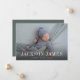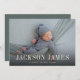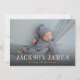 Un diseño de anuncio de nacimiento simple y atemporal que incluye una foto horizontal o orientada al paisaje con el nombre del bebé y las estadísticas de nacimiento colocadas en el fondo con letras blancas clásicas. Añade tres fotos cuadradas adicionales a la parte posterior, junto con un mensaje personal.