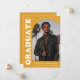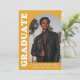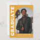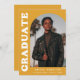 Invitación de graduación elegante y de moda que presenta la foto del graduado en la parte delantera con un marco fotográfico en arco de desvío. "Graduado" se muestra en negrita con letras retro blancas en un fondo amarillo-naranja. Personalice la parte delantera de la invitación de graduación de fotos en arco agregando el nombre del graduado, la escuela y el año de graduación. La tarjeta se revierte para mostrar otras 3 fotos con espacio para texto personalizado como futuros planes universitarios, planes de carrera, detalles de la fiesta de graduación, etc. La invitación de graduación amarillo-naranja es perfecta tanto para graduados de secundaria como universitarios.