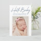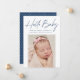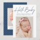 Tarjeta de anuncio de nacimiento moderna que incluye "Hello Baby" en un guión de firma azul marino con el nombre de su bebé, estadísticas de nacimiento y foto que se muestra a continuación. La tarjeta de anuncio de nacimiento de la foto se revierte para mostrar una foto adicional y un mensaje personal con un fondo de puntos polka azul oscuro y blanco.