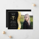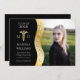 Celebra tu graduación favorita de la facultad de medicina con este diseño de fotos en tonos negros y dorados de "Graduado". La plantilla presenta un aspecto ondulado en el lado izquierdo con la palabra "Graduado" en el fondo ondulado dorado acompañado de un esquema de tono dorado caduceus con oro plano "M" y "D" a la izquierda y el año de clase, nombre y escuela de su graduado en blanco. Diseño de Holiday Hearts Designs (derechos reservados) con crédito de foto de marcador de posición a Mike Austin vía Unsplash.
